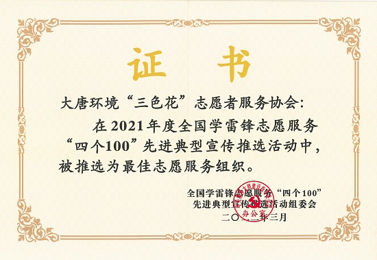 本网讯 近日,在中央宣传部、中央文明办等部门和单位共同组织开展的2021年度全国学雷锋志愿服务“四个100”(100个最美志愿者、100个最佳志愿服务组织、100个最佳志愿服务项目、100个最美志愿服务社区)先进典型评选中,大唐环境“三色花”志愿服务协会荣获全国最佳志愿服务组织称号。在“四个100”评选中,中央企业共有6个项目(组织、个人)获奖。